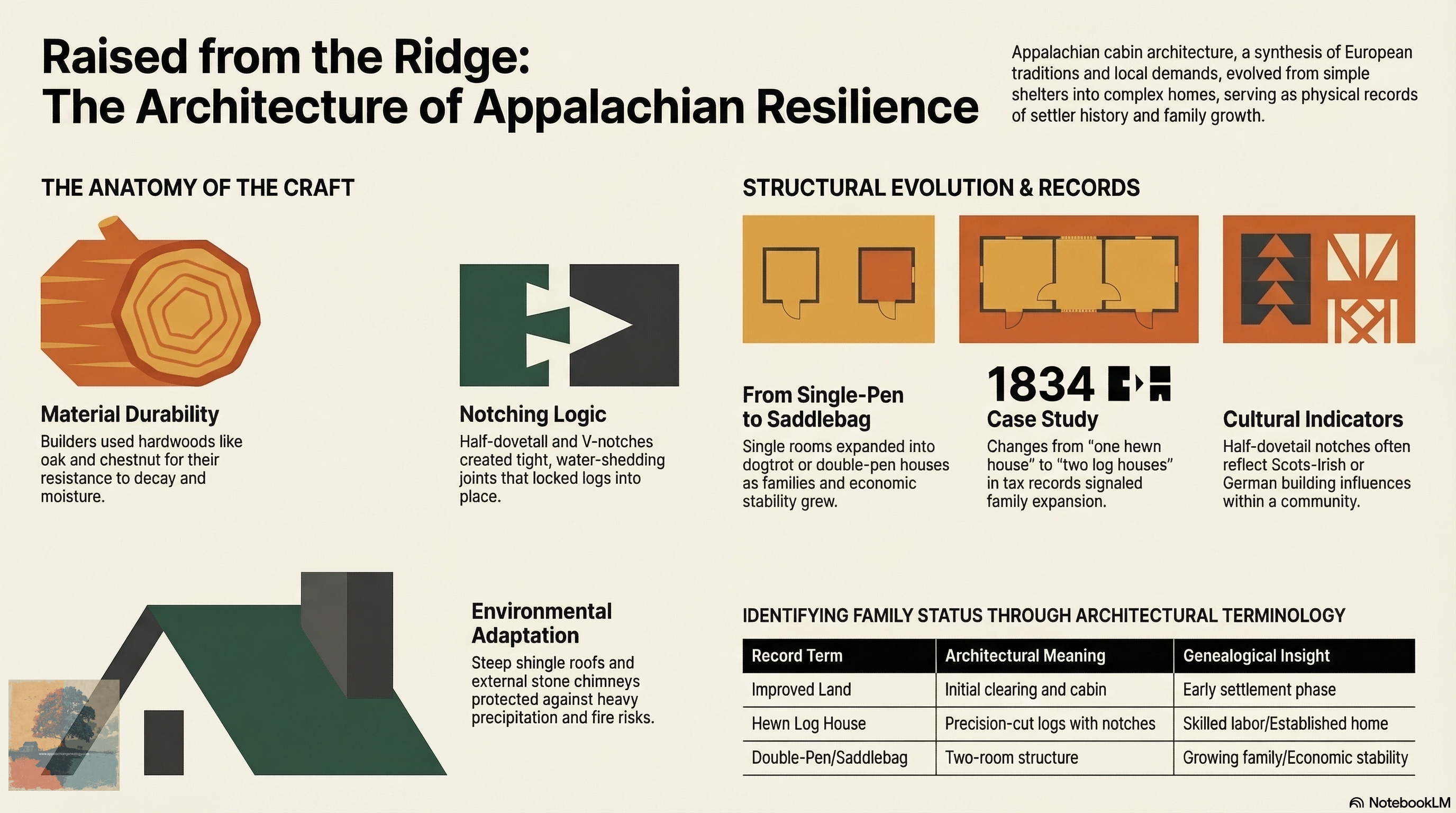 Clusters of similar cabin styles within a hollow or ridge community may reflect shared cultural origins or kinship networks.
