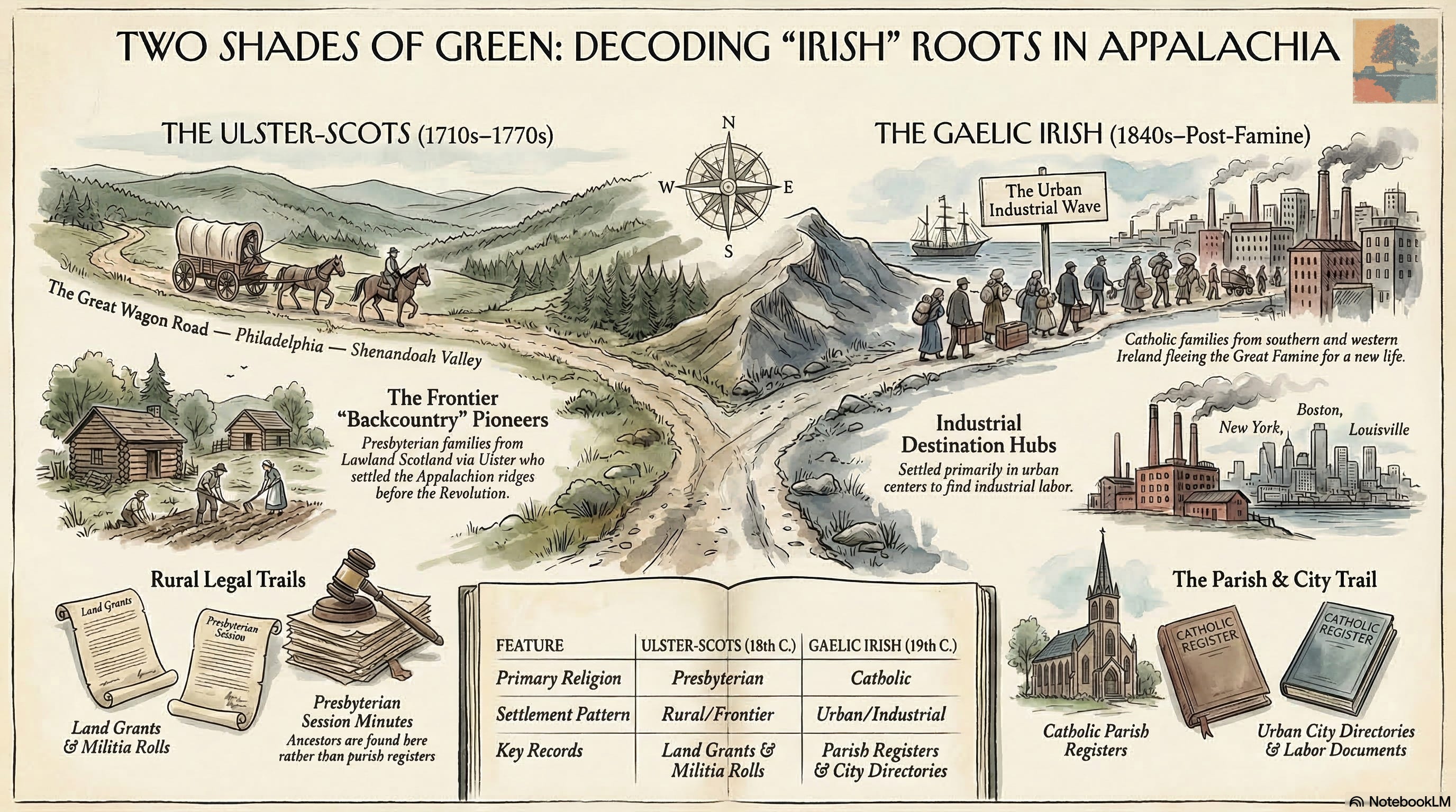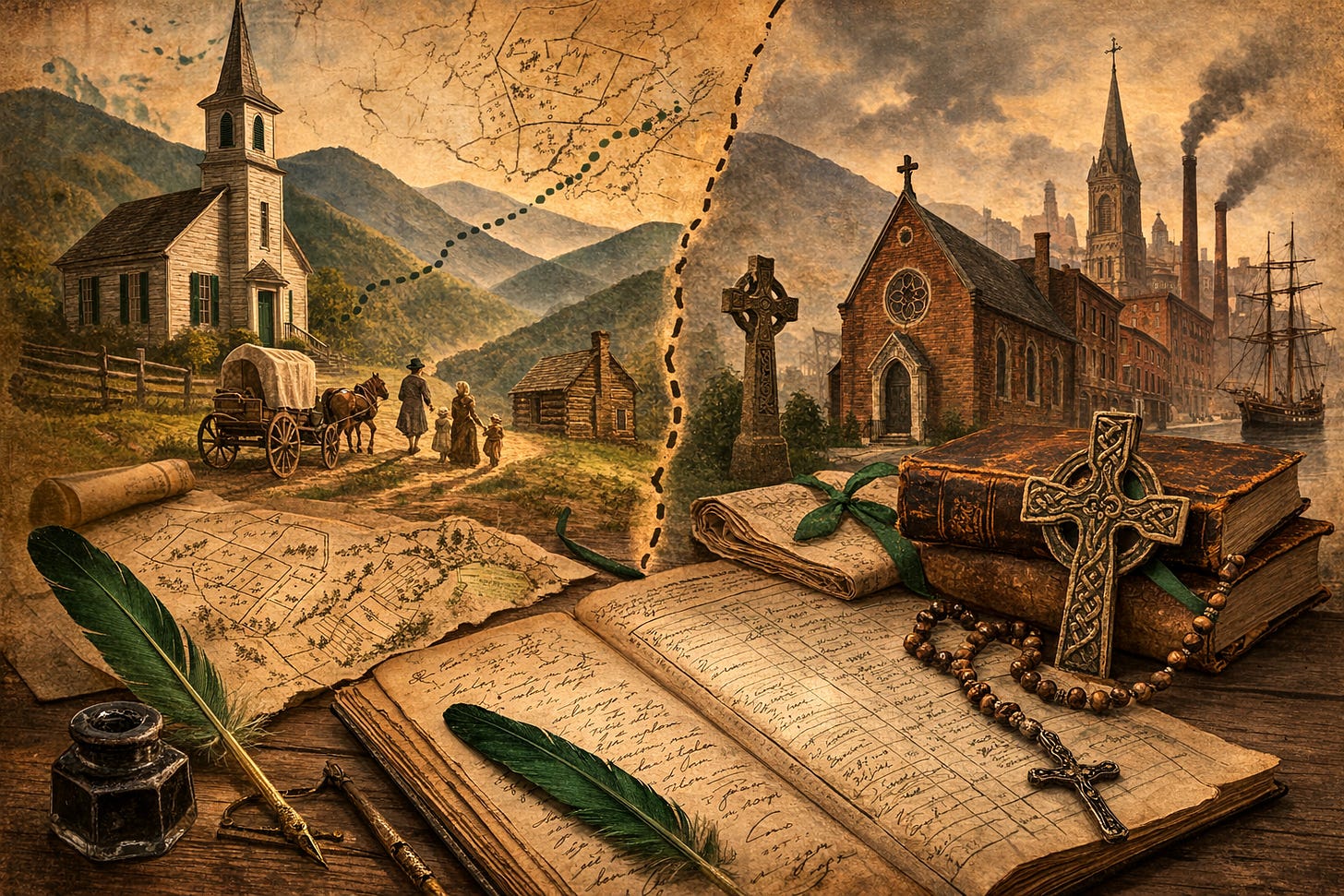 The green ribbons and shamrocks that appear every March often blur a truth that matters deeply to Appalachian family historians. In these mountains, the word “Irish” has long carried two very different meanings. One belongs to the Ulster‑Scots families who carved early roads into the backcountry during the eighteenth century. The other belongs to the later Gaelic Irish migrants who arrived in the United States during the nineteenth century and built new lives in cities shaped by industry and immigration. These groups shared an island for a time, but they did not share the same history, religion, migration pattern, or cultural imprint on the Appalachian frontier. Understanding the difference is essential for anyone tracing a family line that winds through the ridges and river valleys of the region.